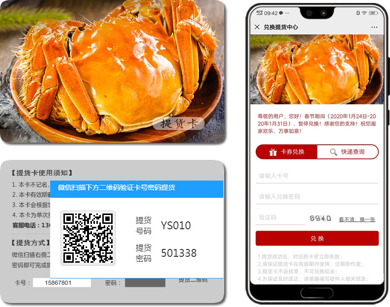 實體禮品卡券提貨兌換系統(tǒng)_禮品券掃碼兌換系統(tǒng)-提貨易 提貨易系統(tǒng)是優(yōu)秀的大閘蟹提貨系統(tǒng)和禮品卡券提貨系統(tǒng),支持手機、微信、小程序、二維碼、PC等方式自助提貨,支持整合微信公眾號。簡單的定價體系,滿足不同客戶需求,例如用于大閘蟹提貨的用戶可以只開通半年。支持 電子卡券和實體卡券。 好提貨系統(tǒng)適用于大閘蟹提貨、海鮮提貨、水果提貨、茶葉提貨、大米提貨、農(nóng)產(chǎn)品提貨、月餅等提貨用途,以及禮券提貨、禮品卡、提貨卡等多種提貨用途。