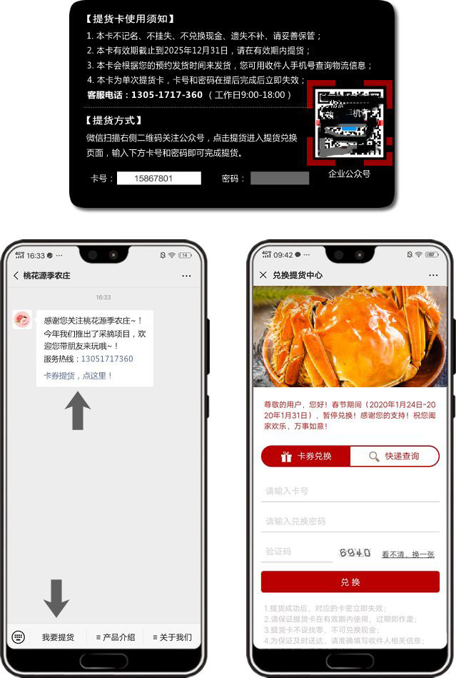 (商家公眾號二維碼印刷在大閘蟹卡券上,引導用戶關注公眾號后提貨)
